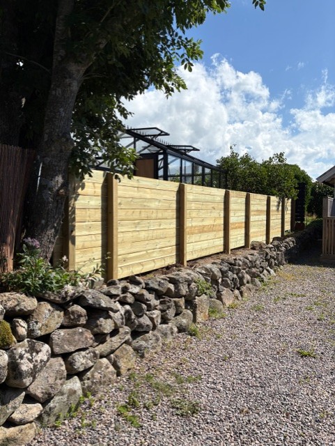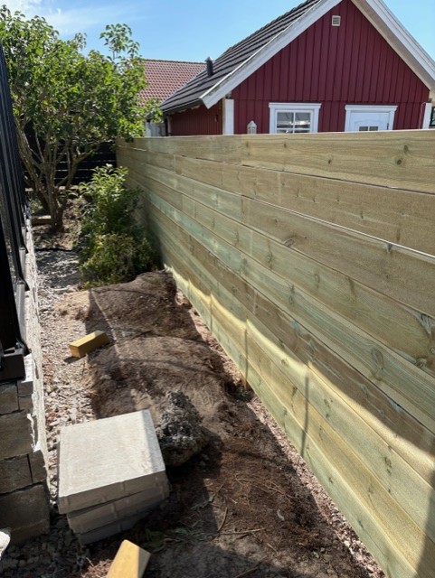 Utöver detta byggde vi ett staket anpassat efter tomtens utformning, vilket skapade en tydlig avgränsning och ett enhetligt helhetsintryck runt fastigheten.
